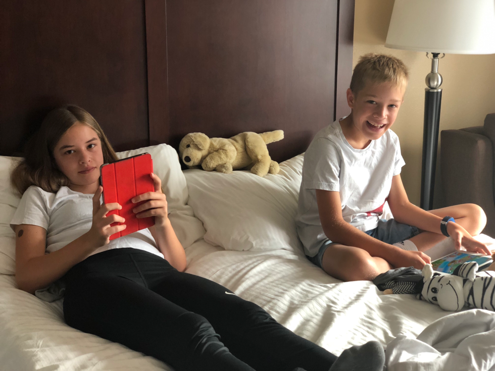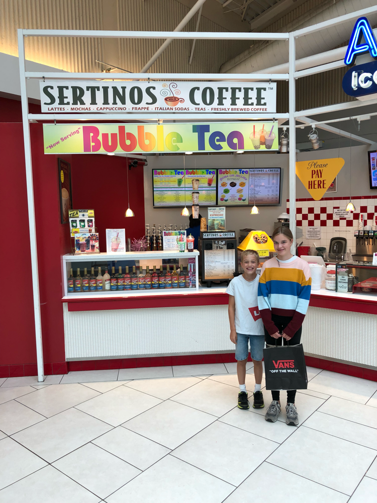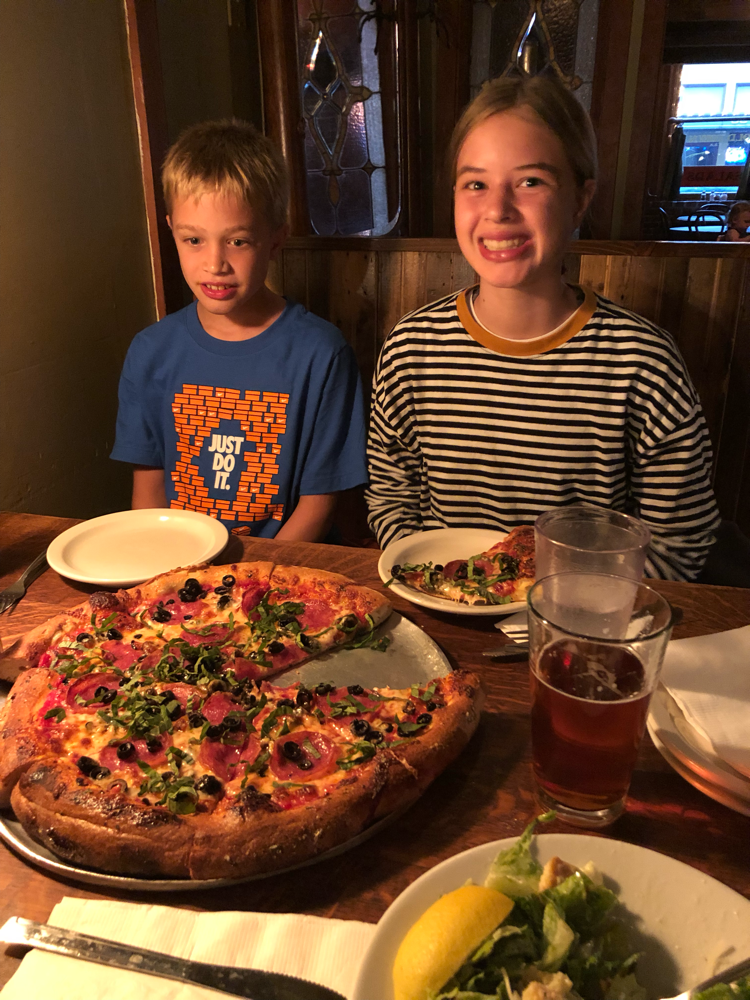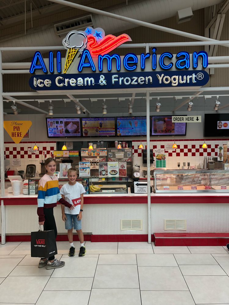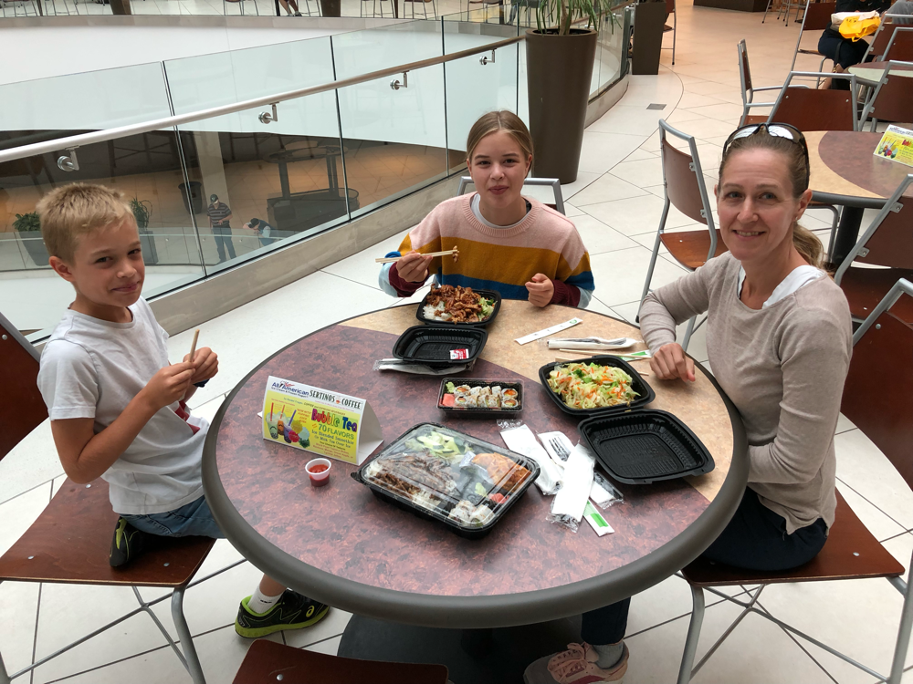 [Louisa] Heute haben wir mal „ausgeschlafen“. Ich bin um halb acht aufgewacht und konnte nicht mehr einschlafen. Die anderen wachten kurz später auf. Es ging nach dem Frühstück, dass nicht ganz so lecker war, zum Lloyds Center shoppen. Viele Shops kannten wir nicht, aber wir waren (alle außer Juli) erfolgreich. Der wollte nur einen Bubbletea. Bei Nike waren wir davor noch. Dort war auch Juli erfolgreich. Für To hatten wir davor auch noch einen Walgreens durchsucht. Nach diesen Sachen fuhren wir wieder ins Hotel. Dann ging’s mit der Bahn nach Downtown Essen. Wir gingen in eine Pizzeria, die Mama schon vorher ausgesucht hatte. Dort sah es aus wie in einem Wohnzimmer. Der Boden war nicht mehr so gut und hatte sogar ein Loch. Die Pizzen waren aber sehr lecker. Auf dem Rückweg haben sich ein paar Leute in der Bahn gestritten, was ich ein bisschen gruselig fand.