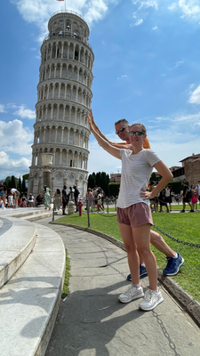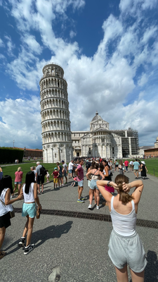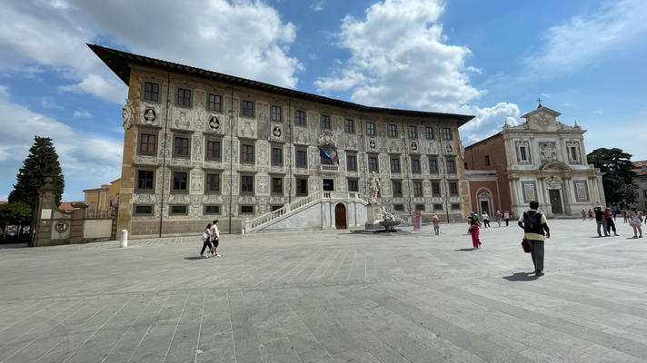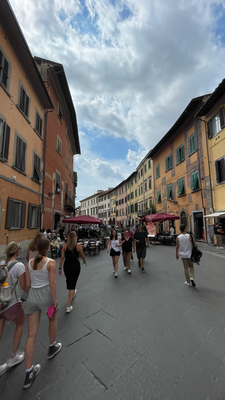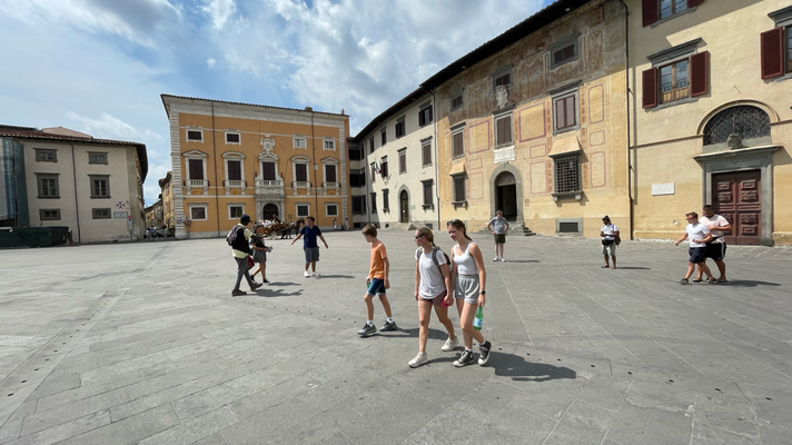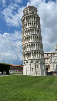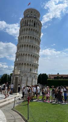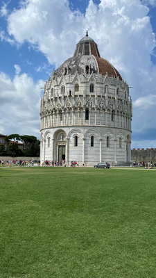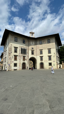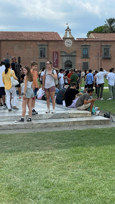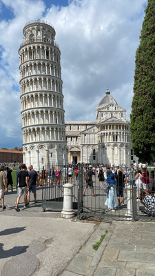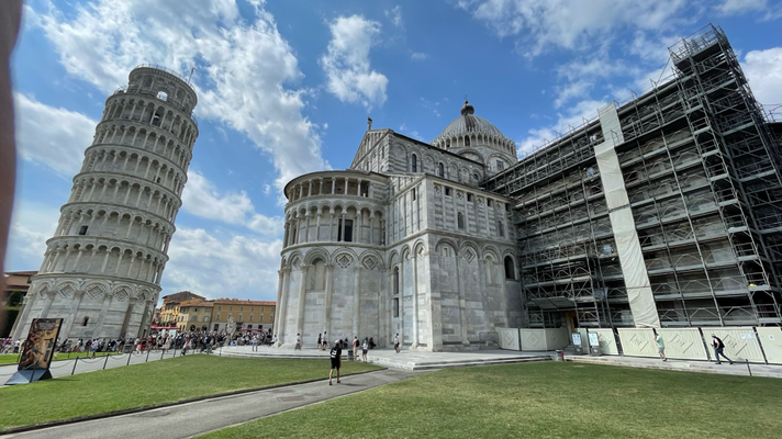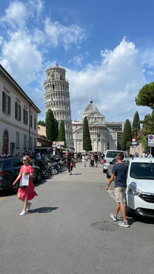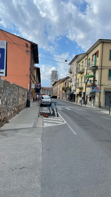 Wir sind auch an Genua vorbei gefahren und unseres Wissens nach über die neu erbaute Brücke drüber (2018 war die alte Brücke - Teil der innerstädtischen Autobahn - eingestürzt und es kamen über 40 Menschen ums Leben). In Pisa ist die Parkplatzsuche etwas diffizil, vor allem vor dem Hintergrund, dass es wohl doch ab und zu Autoaufbrüchen kommt. Mit allem Gepäck an Bord wäre das etwas misslich. Also fuhren wir zu einem so halblegalen am Stadion (kein Spieltag, sonst werden einfach alle abgeschleppt!). Dort begrüßte uns eine Person of Color und winkte uns ein (ein so ganz offizieller Job war das wohl nicht, vielleicht eher ein „gut gemeinter Vorschlag“…). Er wollte dann auch gleich bisschen Geld von uns, was Mini ablehnte. Geld gibts erst, wenn das Auto auch noch heil und safe ist, wenn wir wiederkommen.